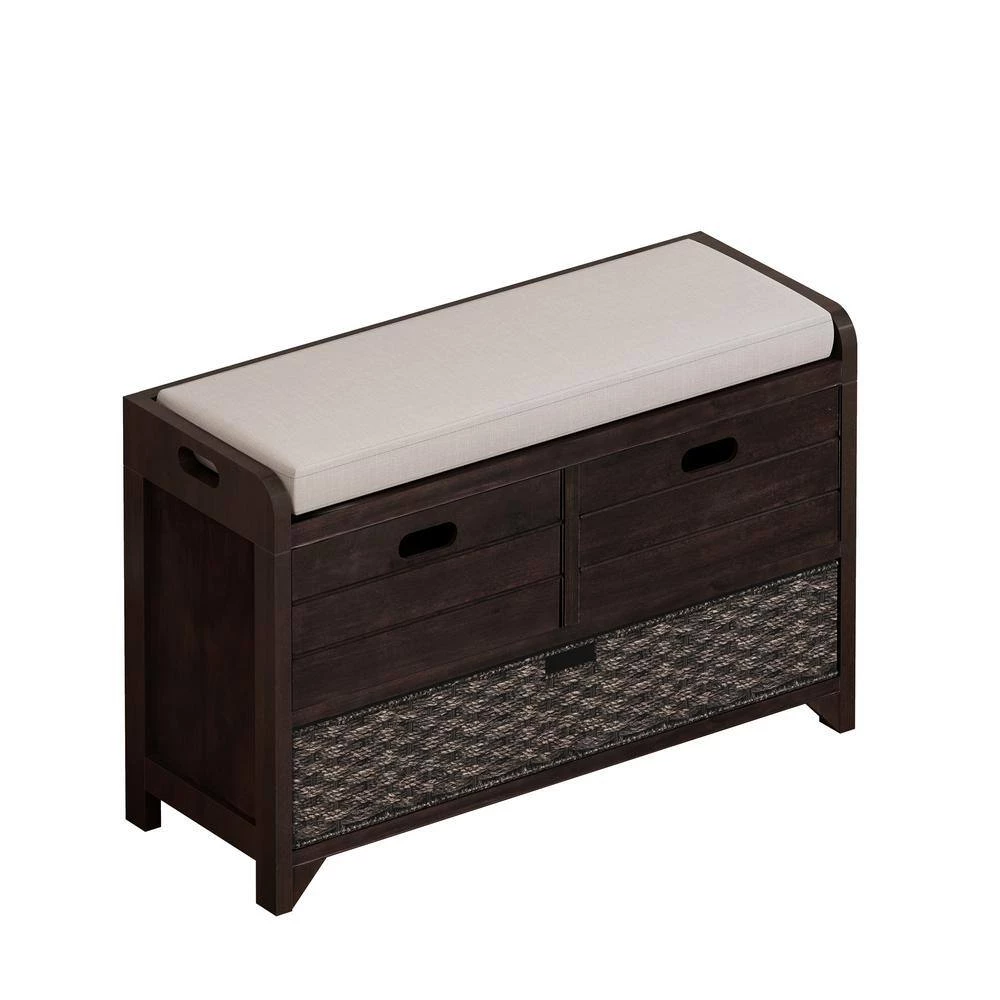 Place this rustic storage bench anywhere in your home with its highly versatile design that will compliment a variety of spaces. A spacious storage space is provided by the 2 drawers and 1 removable basket. This storage bench combines fashion and function, appeal to any home decor.