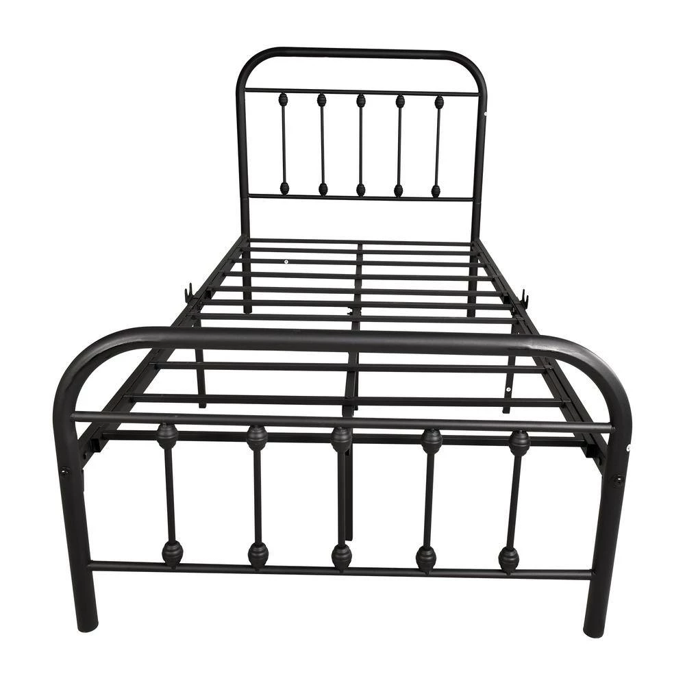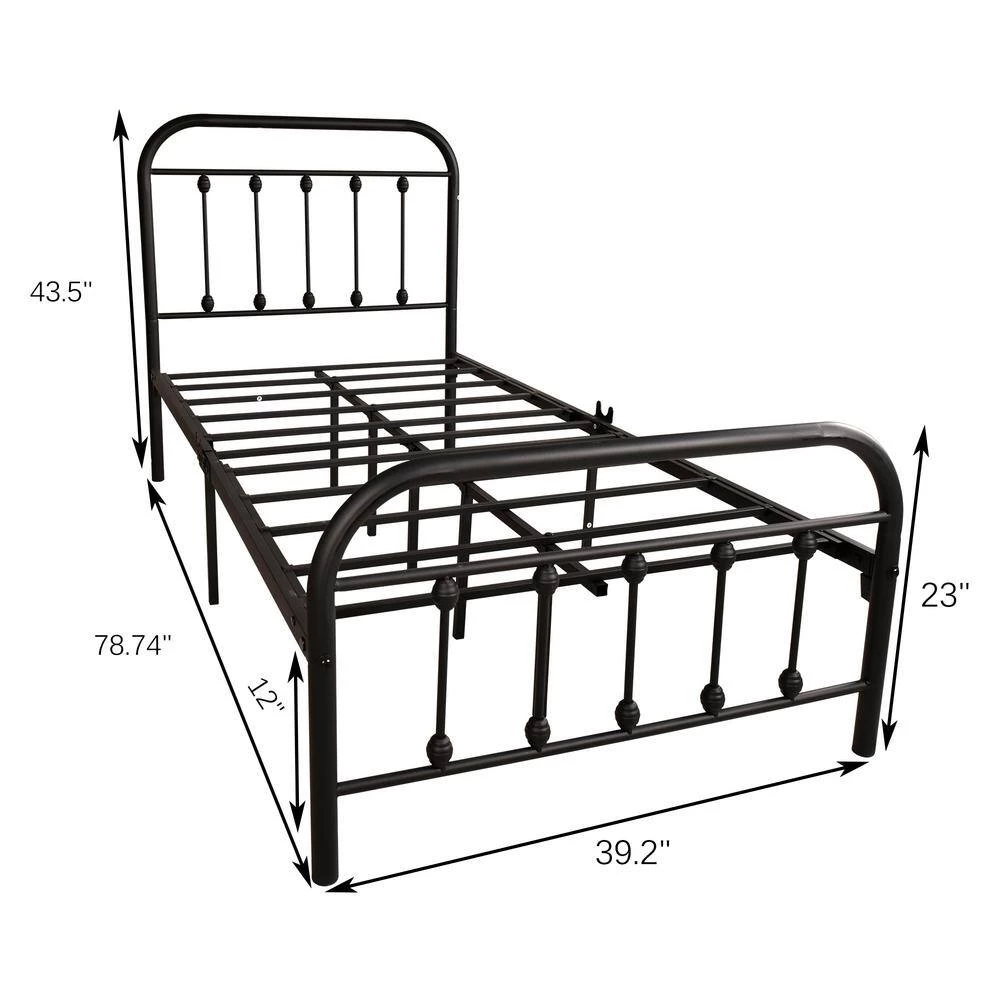 - Platform metal bed with no need for box spring provides valuable under-bed storage. Stylish appearance with vintage headboard and footboard