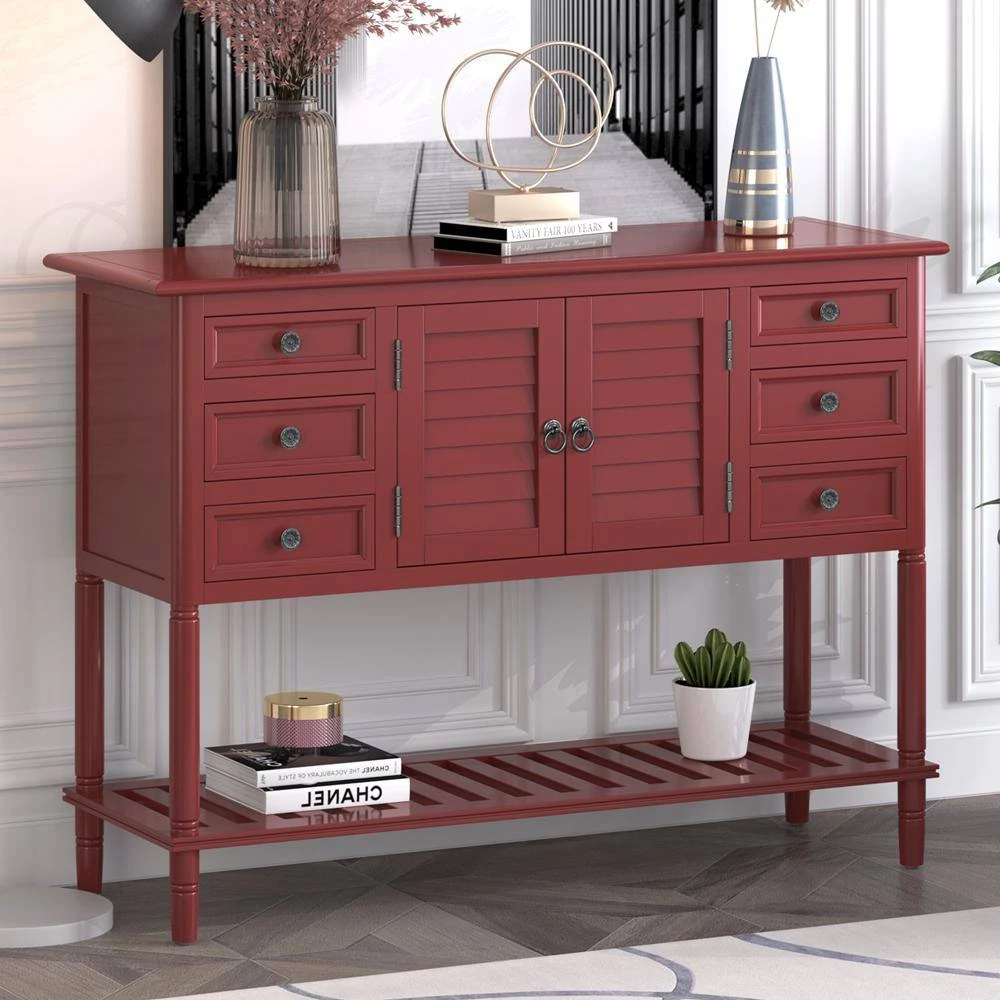 - With built in shelving ranging from the front double doors to the 6 drawers, users will have plenty of space to store their belongings and avoid letting clutter accumulate on the console table.