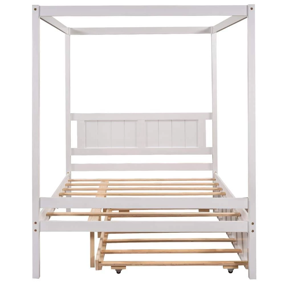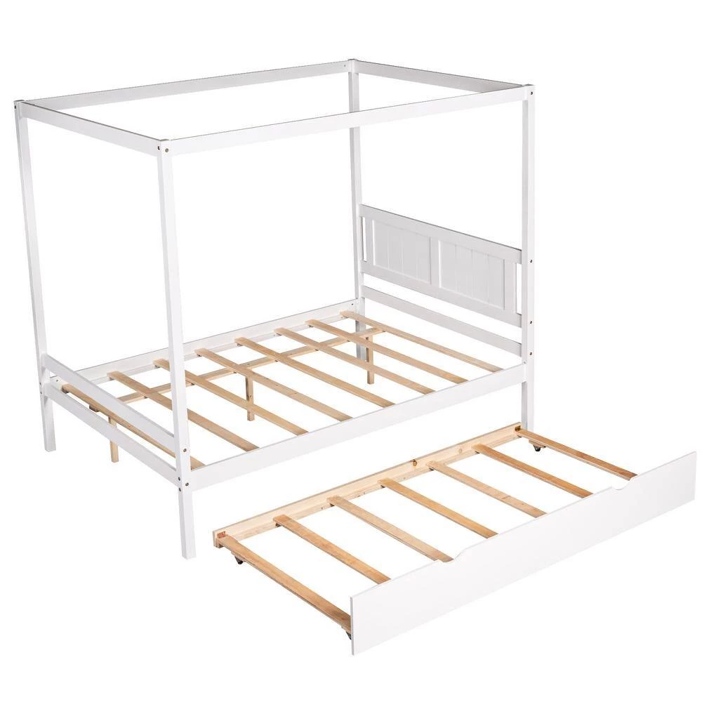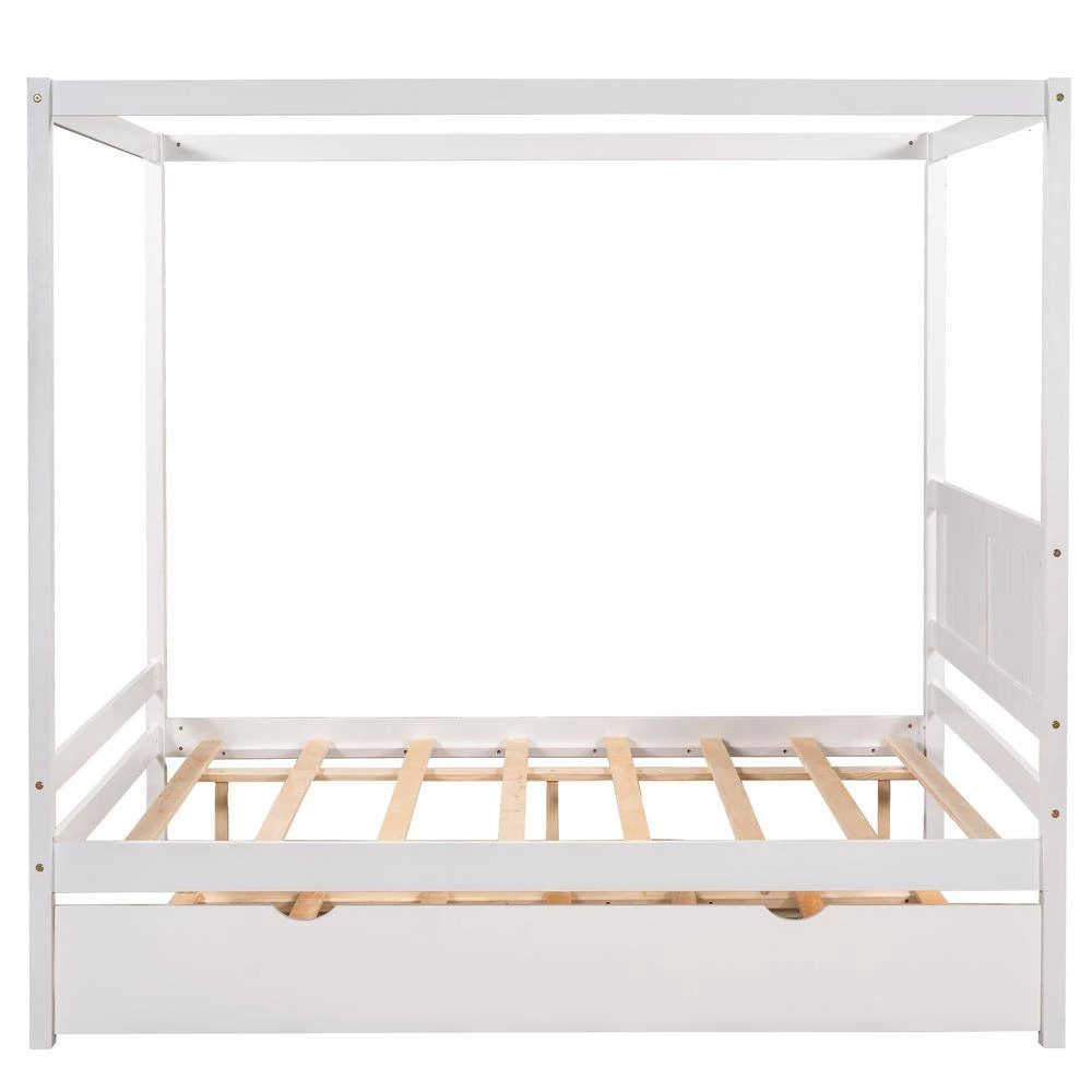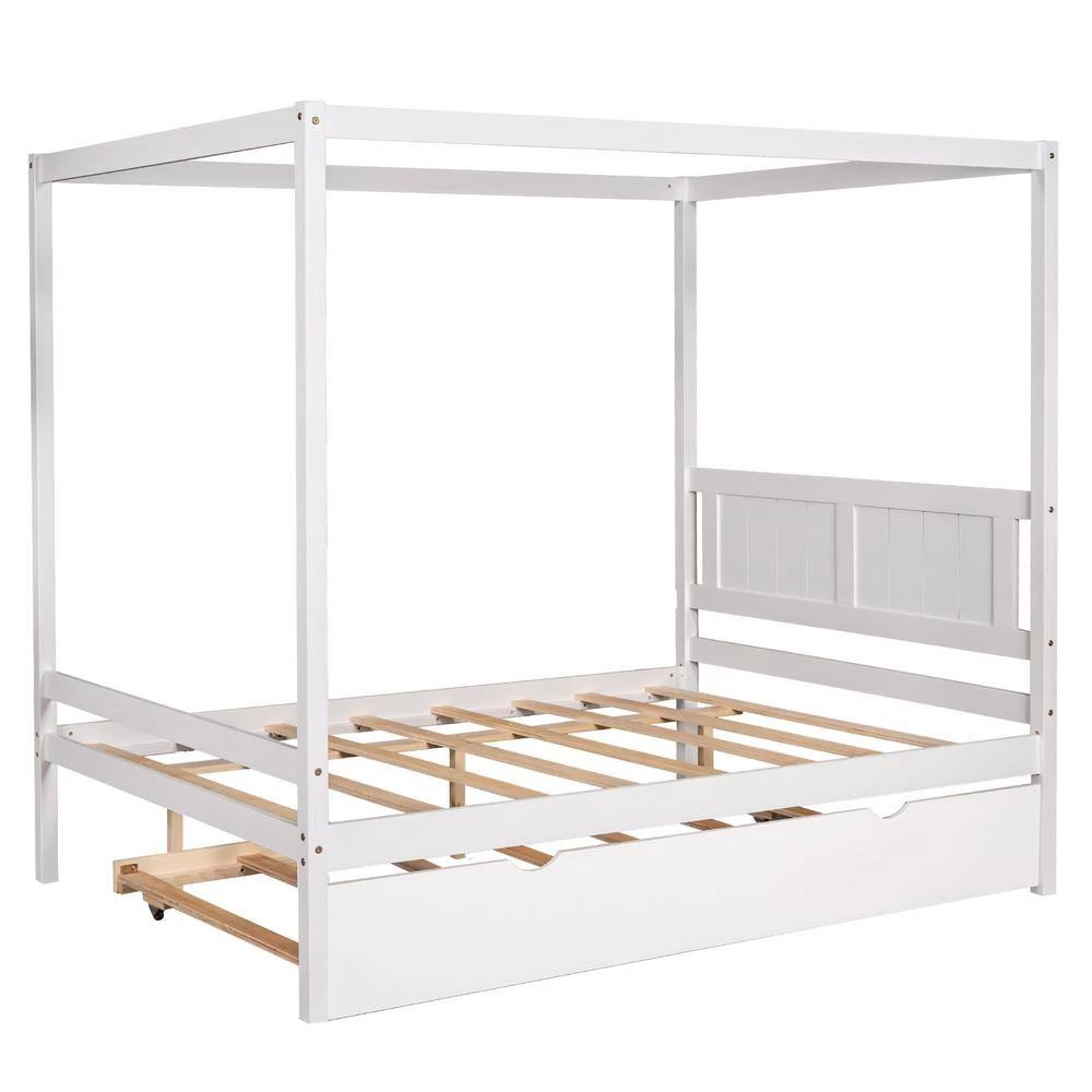 - The canopy platform bed with trundle is an eye-catching piece with a modern design that will make perfect centerpiece for your bedroom. With trundle, it is crafted with a sturdy pine wood and MDF construction. It includes secured wooden slats without needing a box spring. The Canopy includes 8 slats and 3 center support legs for added support and comfort. There are full-length rails on the top of the bed, which can be customized with decorative curtains.