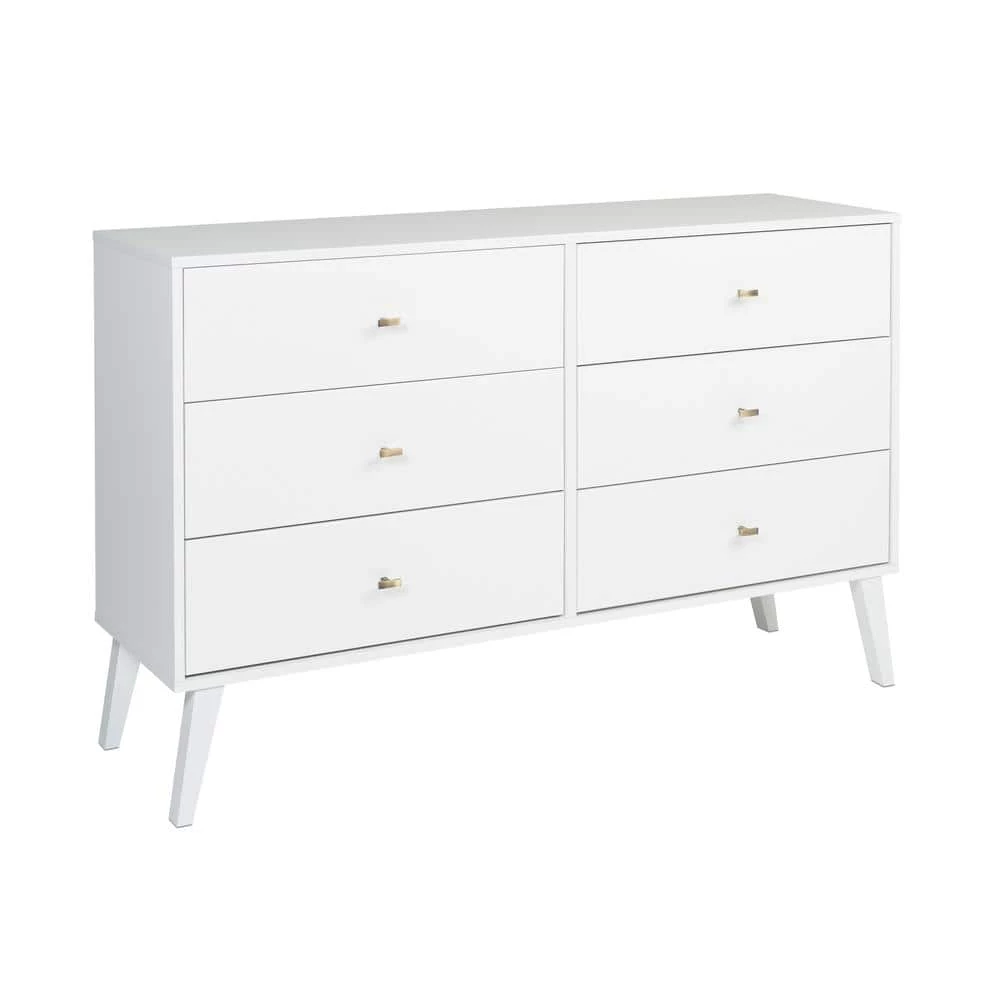 The Prepac Milo 6 drawer dresser is a modern take on a retro look, with a sleek mid-century modern design that adds a touch of vintage styling to your bedroom. Six drawers run smoothly on metal glides, offering easy access to storage for clothing and bedroom items. The tapered solid wood legs and inset drawers deliver a clean and modern look to your bedroom. Brushed brass finished knobs add to the retro-chic design of this functional and fashionable dresser. Style this dresser on its own, or combine it with any of the products in the Milo collection for a timeless look.