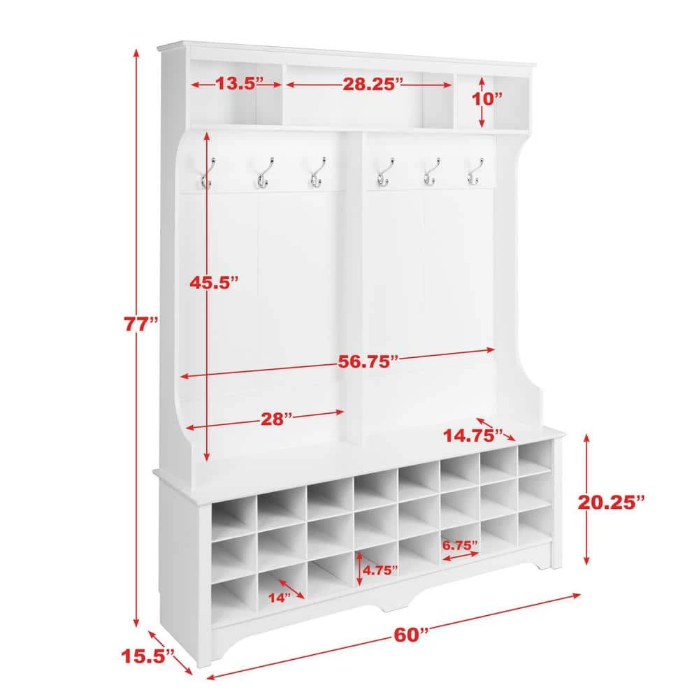 Organize and style your entryway with the Prepac 60 in. Wide Hall Tree. Standing at 77 in. tall and 60 in. wide, this hall tree will provide all the storage space needed for your entryway belongings. Store your larger items in the 3 upper compartments, and hang your jackets, scarves, purses and hats on the 6-strong double coat hooks. A wide bench, with plenty of room, sits on top of 24 individual shoe cubbies. Each shoe cubby is spacious enough to hold a pair of size 13 men’s shoes, keeping them neatly stored and out of the way. The Prepac Hall Trees sleek design fits in with all decors and provides the essential storage space you need.