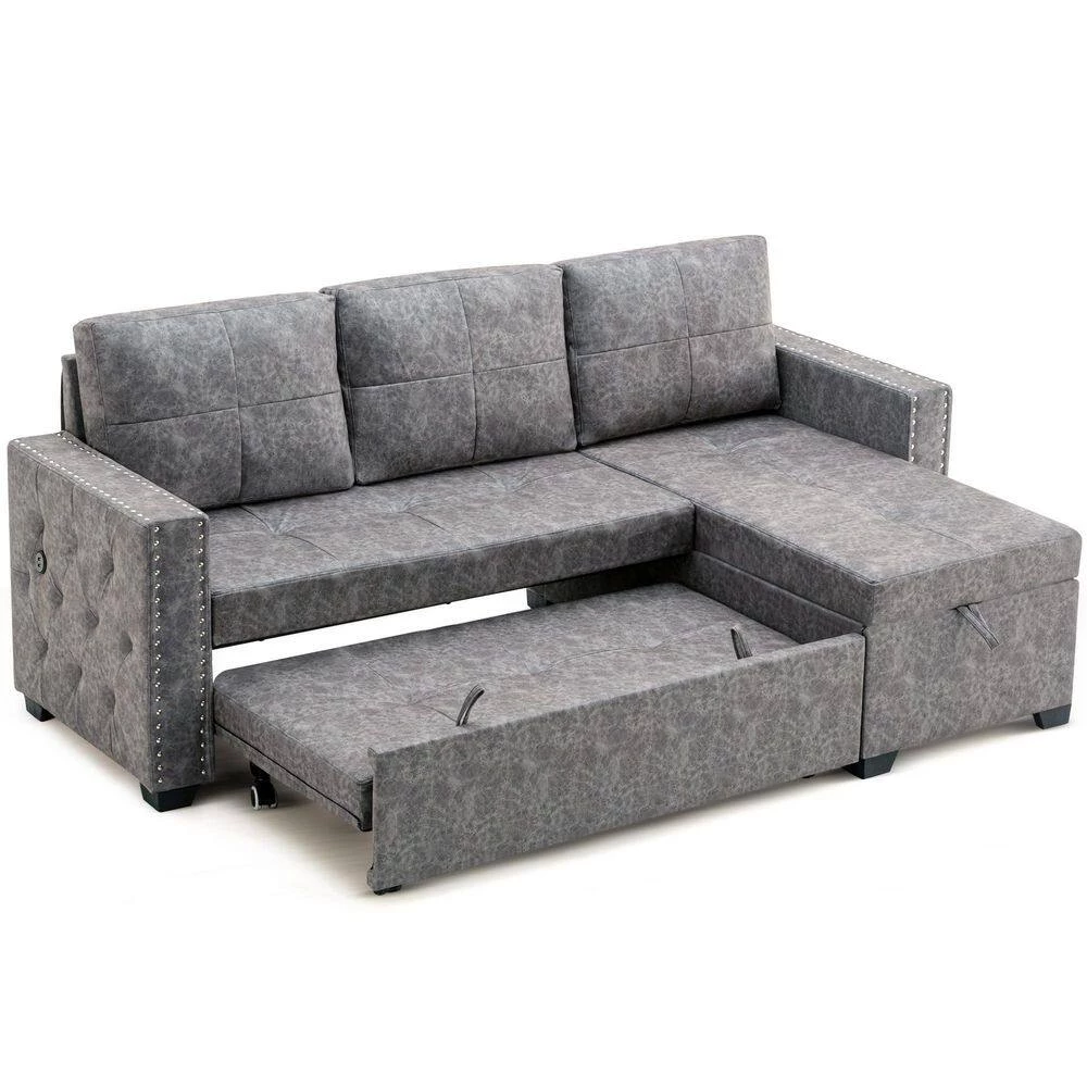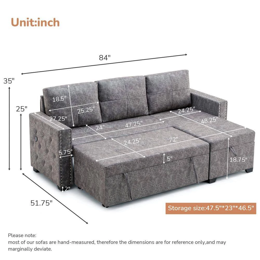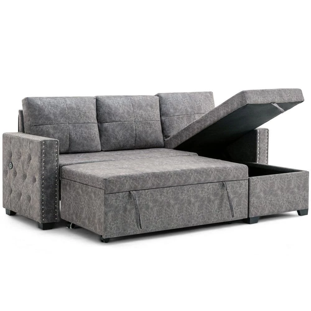- This L-shaped sofa features a pull-out bed that quickly converts into a guest/child’s bed for lounging. Convenient for visiting family and friends.