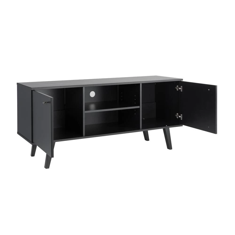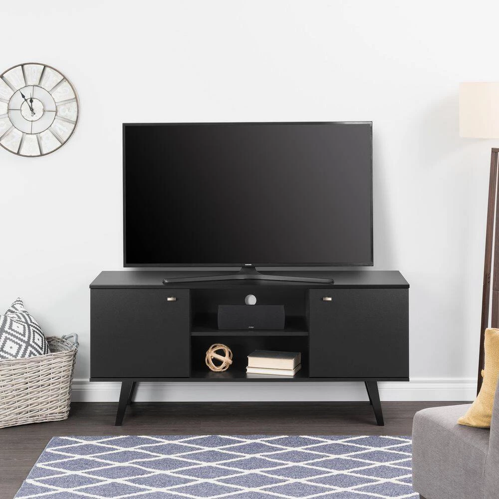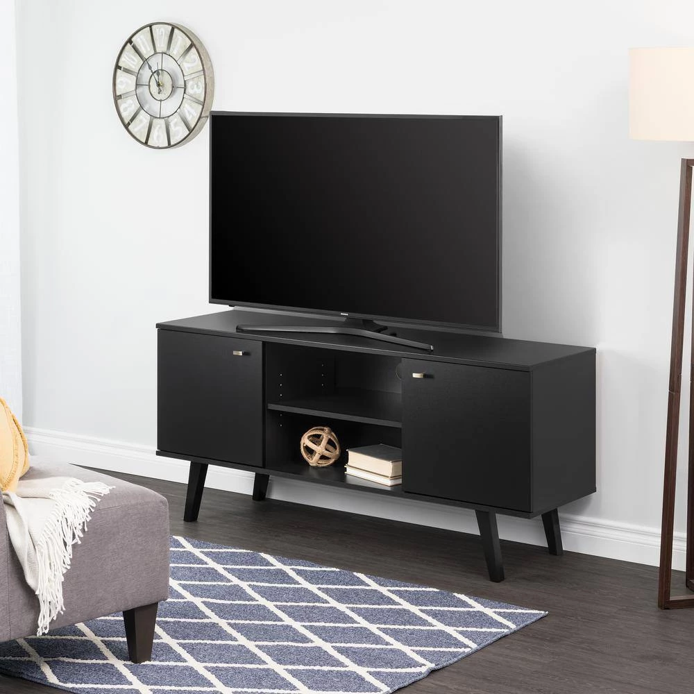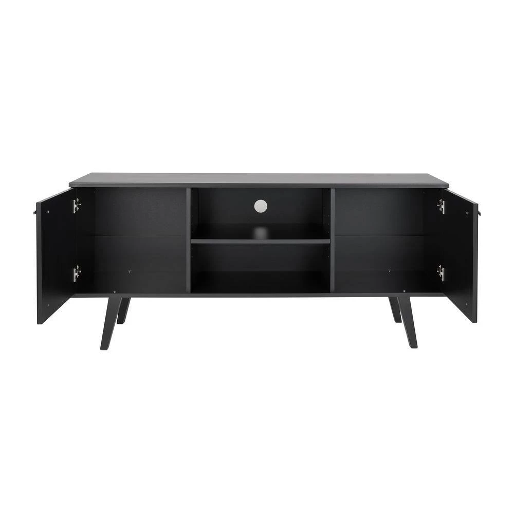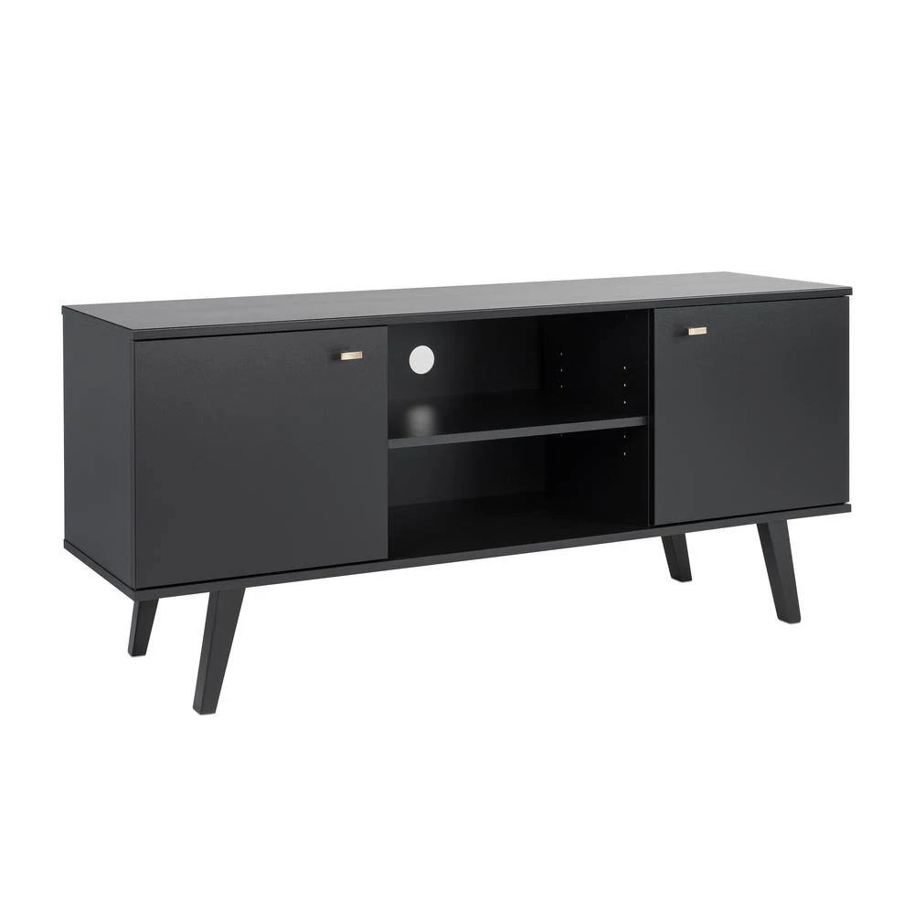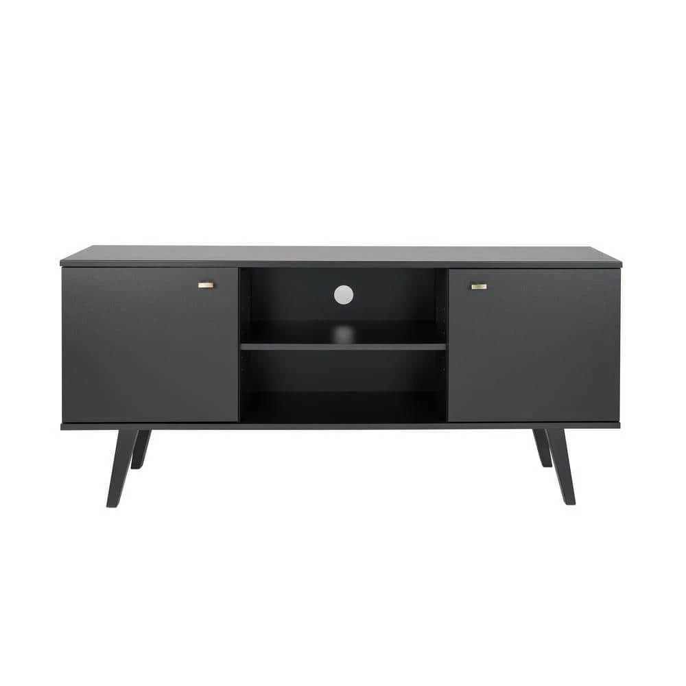 The Prepac Milo 56″TV Console is a modern take on a retro style. The console’s mid-century modern design and functionality make it the perfect fit for all entertainment spaces. Its sleek design offers space for all of your entertainment storage needs. Place TVs up to 65 on top of the console, and store media accessories below in the three compartments. Place books, games and DVDs behind the two large doors and use the middle compartment with an adjustable shelf to place cable boxes and gaming consoles. Keep wires neatly organized and concealed with the cut-out in the middle compartment. Tapered solid wood legs ensure durability and the brushed brass finished knobs deliver a vintage look. Clean lines add to the retro-chic design of this functional and stylish console.