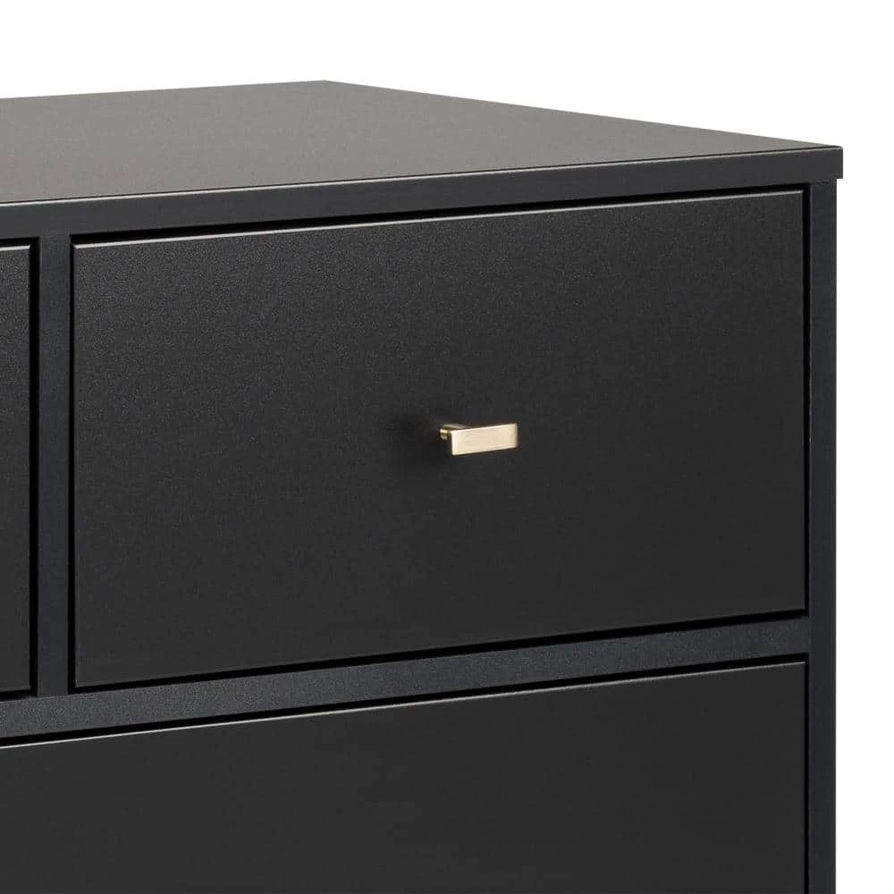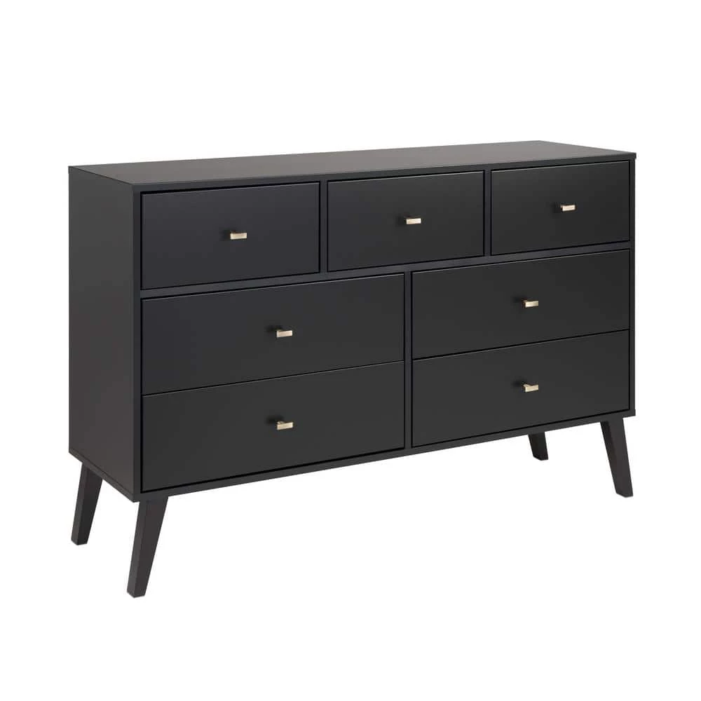 The Prepac Milo 7-drawer dresser is a modern take on a retro look, with a sleek mid-century modern design that adds a touch of vintage to your bedroom. Three small drawers on the top row are well suited for personal clothing, while the 4 large lower drawers have ample room for sweaters and larger items. All seven drawers run smoothly on metal glides, offering easy access to storage for clothing and bedroom items. The tapered solid wood legs and inset drawers deliver a clean and modern look to your bedroom. Brushed brass finished knobs add to the retro-chic design for a functional and fashionable dresser. Style this dresser on its own, or combine it with any of the products in the Milo collection for a timeless look.